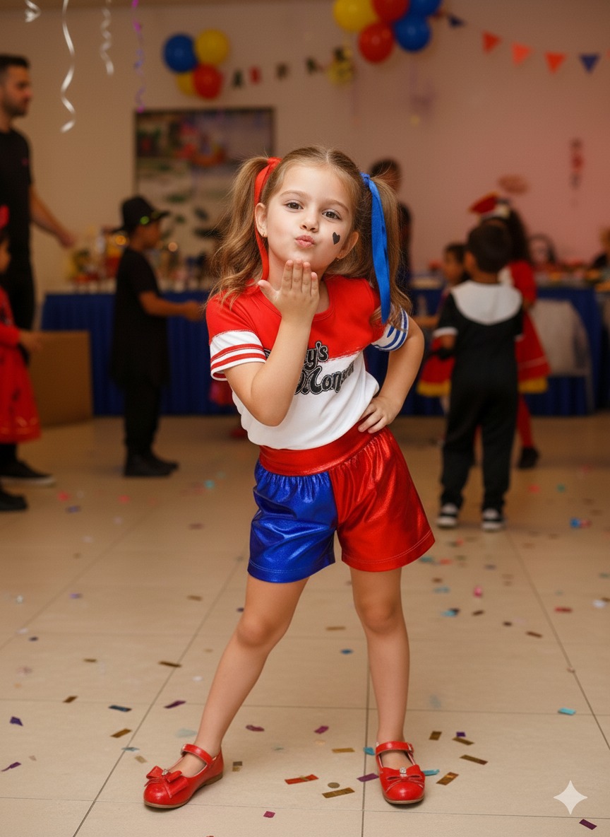 Deixe sua pequena brilhar com a Fantasia Arlequina, inspirada na icônica personagem dos quadrinhos e filmes! Com um visual descolado e cheio de atitude, essa fantasia é perfeita para festas temáticas, Carnaval, Halloween ou brincadeiras de supervilões e heróis.
