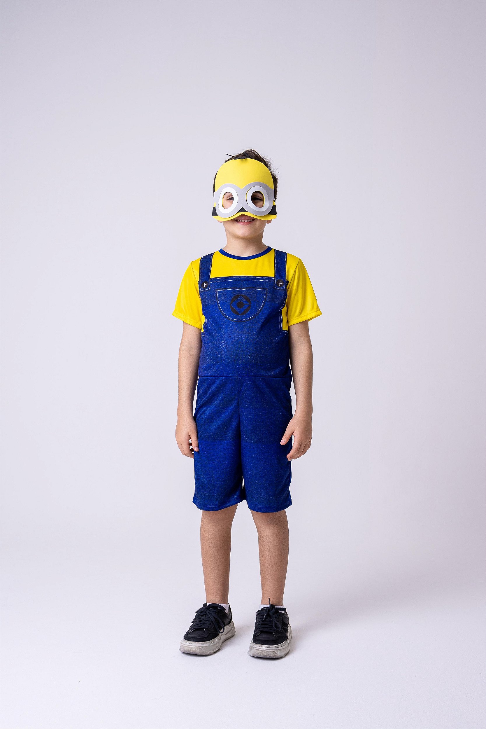 Estampa que imita o clássico macacão jeans azul dos Minions, com camiseta amarela integrada.