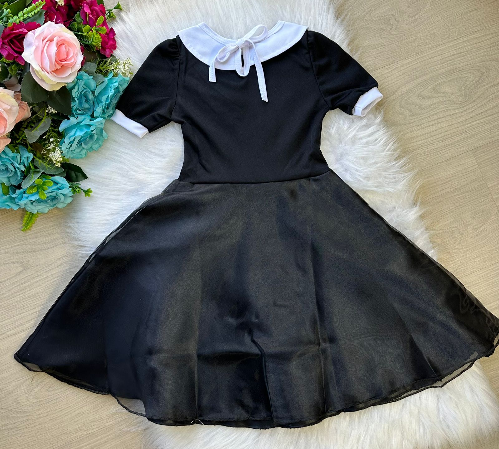 Design único: Vestido preto com gola e punhos brancos, inspirado no clássico visual da personagem.